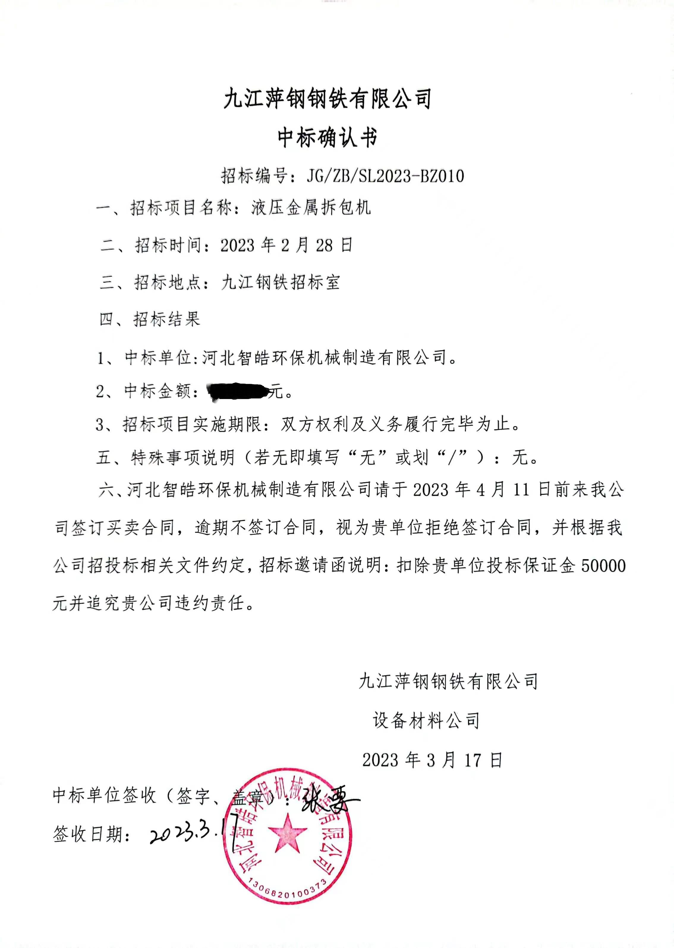 九江萍鋼鋼鐵有限公司液壓金屬拆包機中標公示